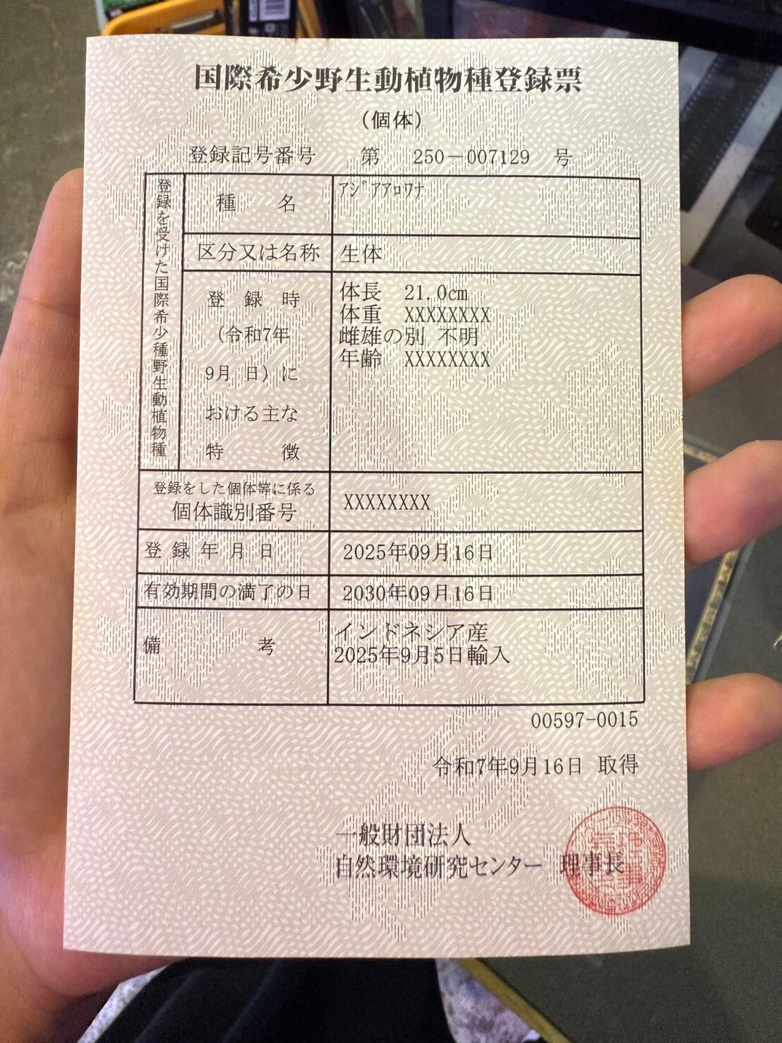 ※アジアアロワナは種の保存法に基づき、所定の登録機関に所有者変更の届け出が必要です