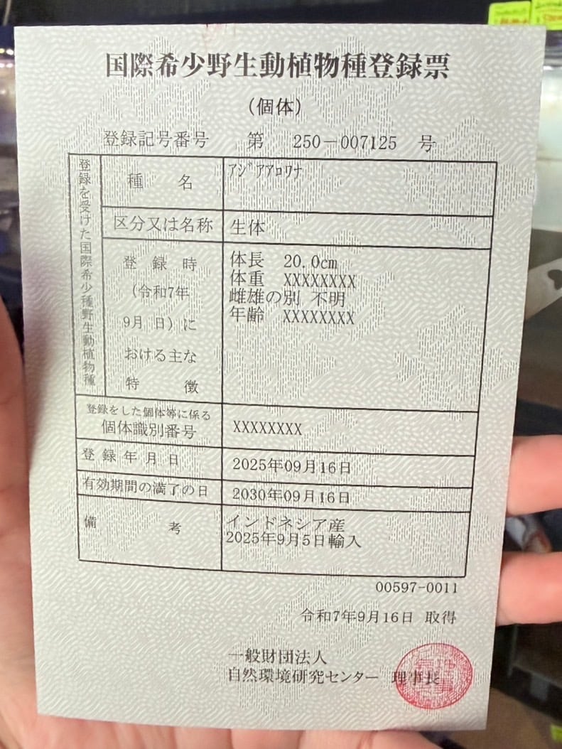 ※アジアアロワナは種の保存法に基づき、所定の登録機関に所有者変更の届け出が必要です