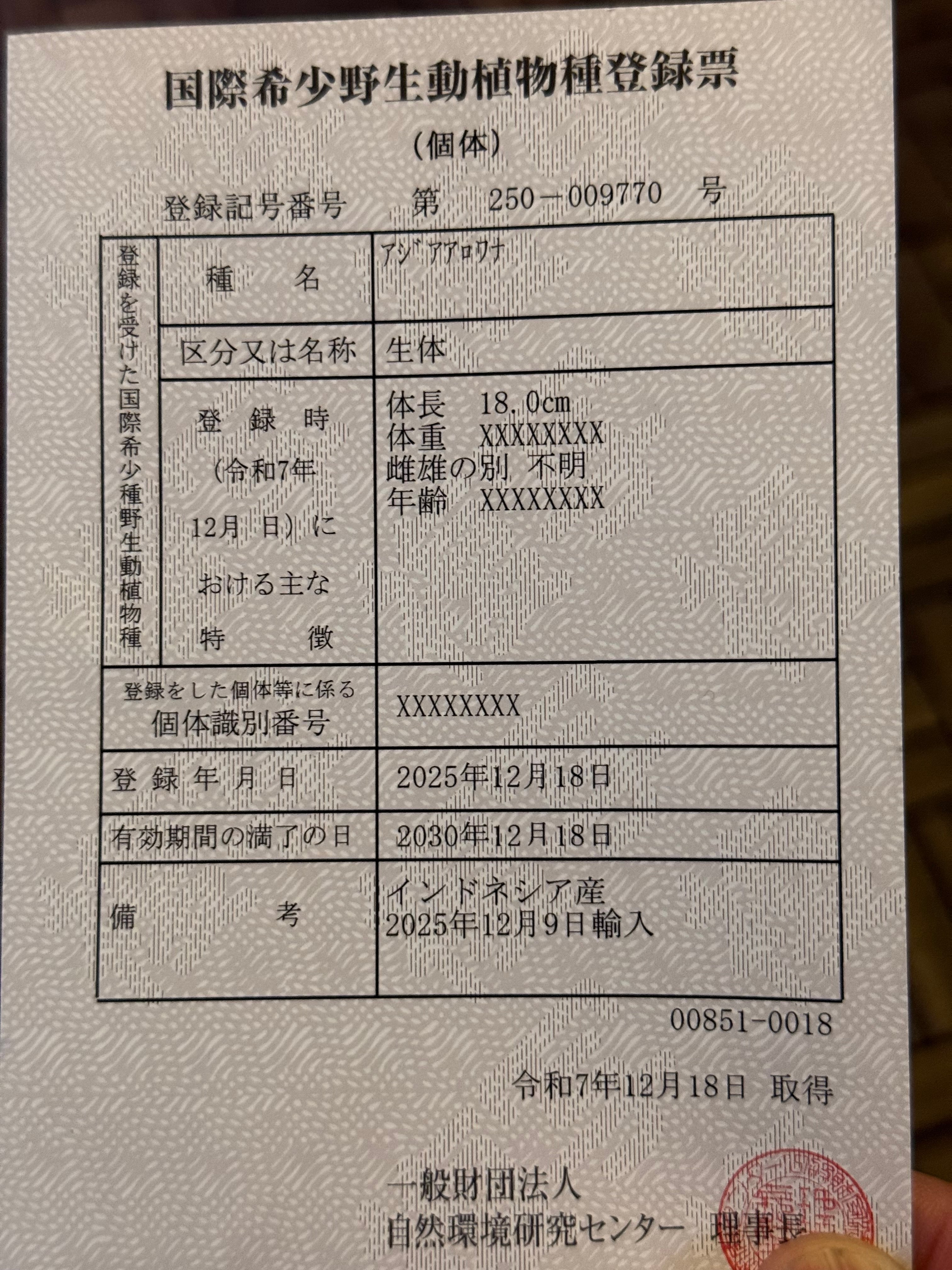 ※アジアアロワナは種の保存法に基づき、所定の登録機関に所有者変更の届け出が必要です